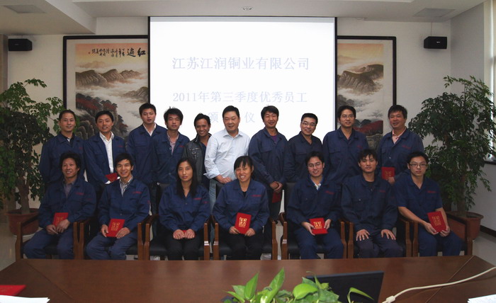 10月16日下午,在江潤銅業辦公樓一樓大會議室,總經理駱偉棟主持召開了2011年第三季度優秀員工表彰大會。三季度共評選出17名優秀員工,其中15名來自生產一線。駱總表示,上下一心,共同努力,實現企業與個人的共同發展。